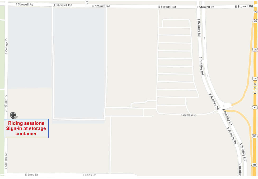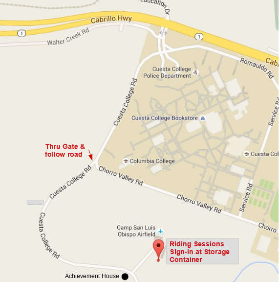Riding Location (CMSP Motorcycle Training Course and Advanced Rider Course) Camp San Luis Obispo Airfield, 3003 Cuesta College Drive (across from the Achievement House). GPS coordinates 35.3249, -120.7443